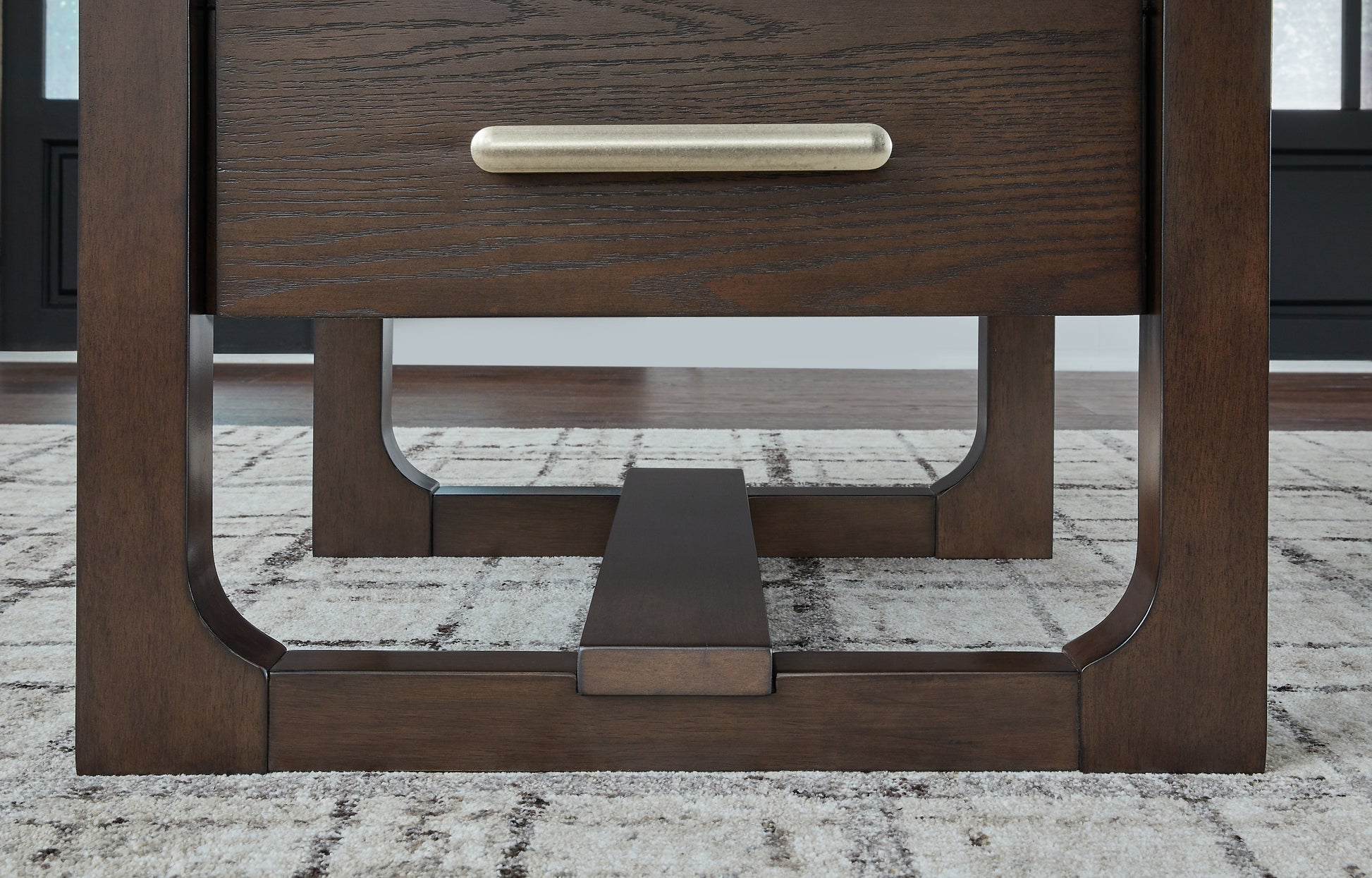 If casual contemporary style is your thing, then you'll love this end table. A wood-tone finish with a rich, dark grain contrast lends a soothing sensibility, while the unique open shelf design and spacious storage drawer add function to great form. Sleek and stylish, this piece is a fresh take on cool for the modern home.