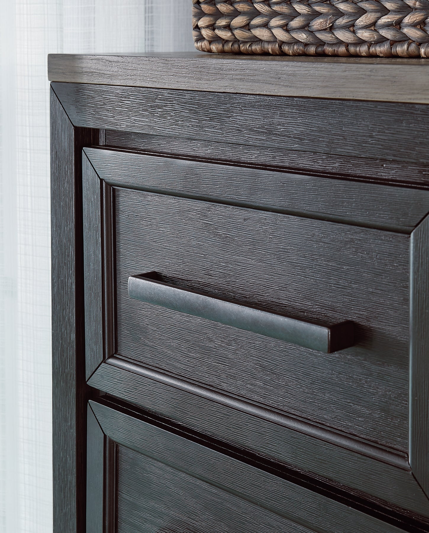 | Details | B989B5: Includes California king panel headboard, storage footboard, and rails with roll slats, Made with hardwood solids, select oak veneers and engineered wood, Two-tone finish (brushed black and dusty grayish brown wood tone), Headboard with picture frame moulding, Footboard with two deep drawers, Smooth-gliding soft-close drawers with fully finished interiors and dovetail construction, Sleek drawer pulls with black finish, Bed does not require additional foundation/box spring; accommodates most zero clearance adjustable bases with the addition of a bunkie board, Mattress available, sold separately, Assembly required, B989B1: Includes dresser and mirror, Made with hardwood solids, select oak veneers and engineered wood, Two-tone finish (brushed black and dusty grayish brown wood tone), Sleek drawer pulls with black finish, 11 soft-close, smooth-gliding drawers with fully finished interiors and dovetail construction (top drawers felt lined), 5 drawers with brushed black finish; 6 drawers with grayish brown wood tone, 3 drawers located behind each door, Mirror mounts to back of dresser, Assembly required, | |